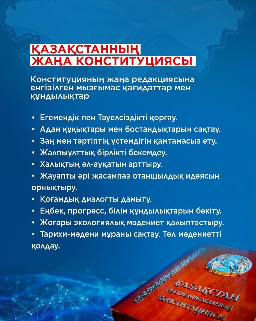 Жаңартылған Конституция мемлекеттің даму бағытын айқындайтын негізгі құндылықтарды жаңа мазмұнмен толықтырып, қоғамдық өмірдің барлық саласына ортақ әділдік, заң және тәртіп қағидаттарын алғаш рет конституциялық деңгейде бекітеді. Бұл нормалар азаматтардың құқықтары…