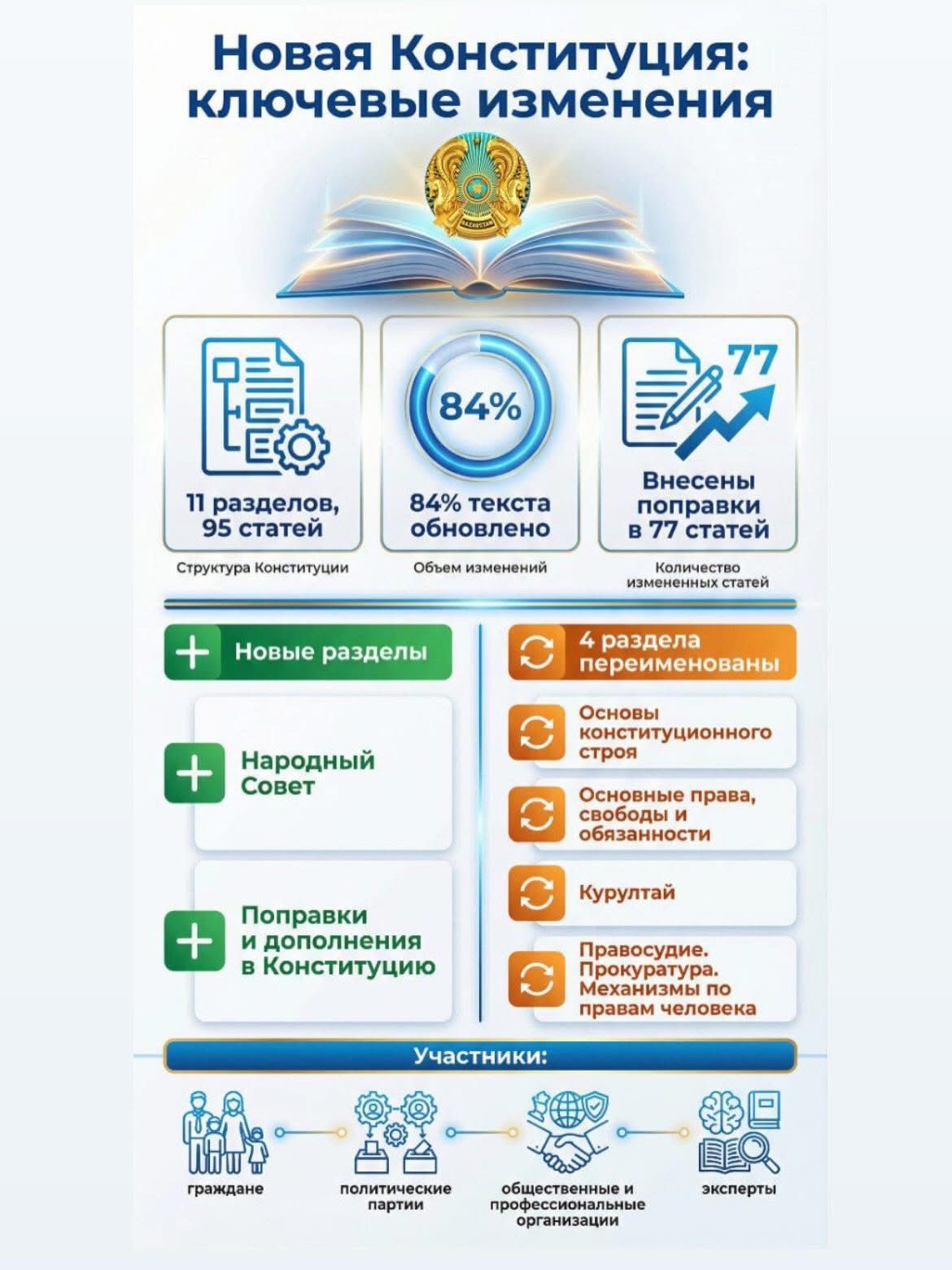 Жаңартылған Конституцияда биліктің бірден-бір бастауы – Қазақстан халқы екені нақты бекітіліп, азаматтардың ел басқару ісіне тікелей қатысу мүмкіндіктері кеңейтіледі. Осы мақсатта халықтың пікірін ескеруге және қоғамдық диалогты нығайтуға бағытталған жаңа…