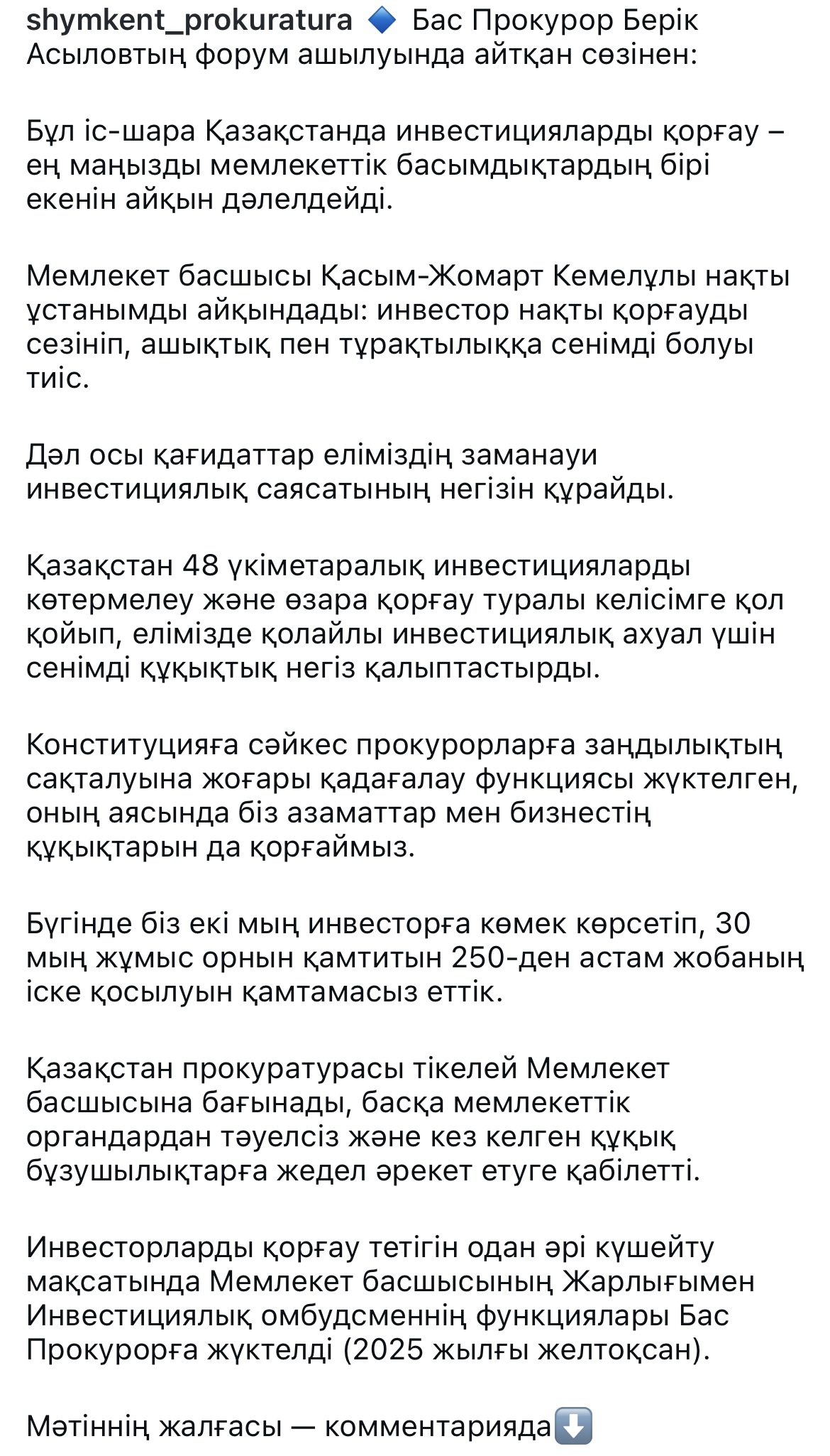 Бас прокурор Берік Асыловтың форум ашылуында айтқан сөзінен: