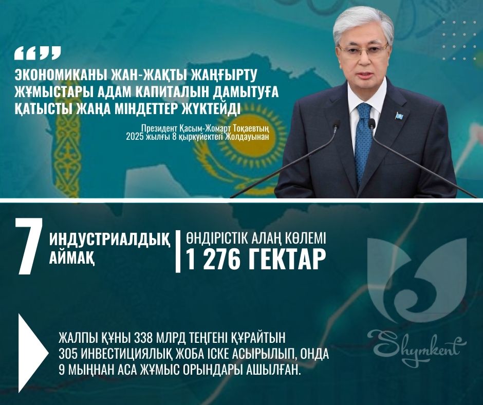 Қазіргі уақытта Шымкентте жалпы көлемі 1 276 гектарды қамтитын 7 индустриалдық аймақ жұмыс істейді. Оның ішінде «Жұлдыз» (306 гектар) және «Бозарық» (132 гектар) индустриалды аймақтары 2024 жылы іске қосылған болатын. Бүгінгі таңда бұл аймақтарда жалпы құны 338 млрд теңгені құрайтын 305 инвестициялық жоба жүзеге асырылып, 9 мыңнан астам тұрақты жұмыс орны ашылды.