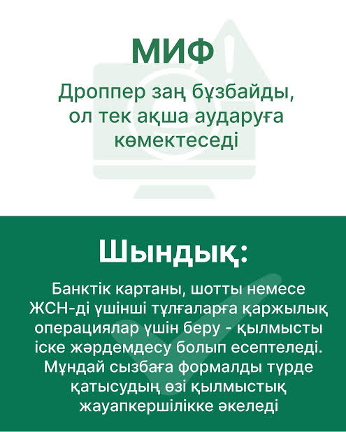 2025 жылғы 16 қыркүйектен бастап Қазақстанда дропперлік үшін жеке қылмыстық жауапкершілік енгізілгенін білу маңызды (ҚР Қылмыстық кодексінің 232-1-бабы).