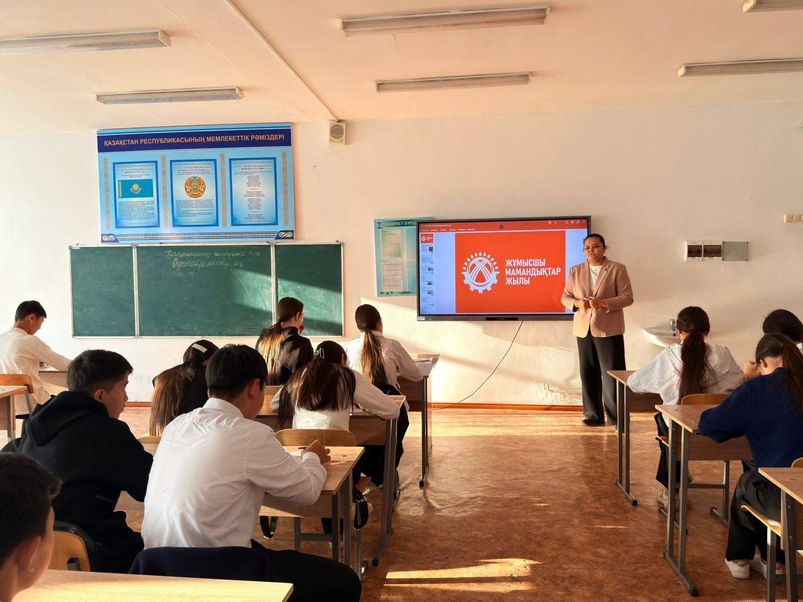 Мемлекет басшысы Қасым-Жомарт Тоқаевтың 2025 жылды «Жұмысшы мамандықтар жылы» деп жариялауына байланысты еліміздің барлық аймақтарында түрлі түсіндіру жұмыстары, кәсіптік бағдар беру кездесулері мен ақпараттық шаралар қолға алынып жатыр. Осы бағыттағы ауқымды жұмыстар аясында Кентау қаласы Ә.Молдағұлова атындағы №19 ақпараттық технологиялар мектеп-лицейінде 9-сынып оқушыларымен кездесу ұйымдастырылды. Жиында кәсіби бағдар беруші педагог А. Кенбай оқушылармен кездесіп, жұмысшы мамандықтарының қоғам үшін маңызын жан-жақты түсіндірді.