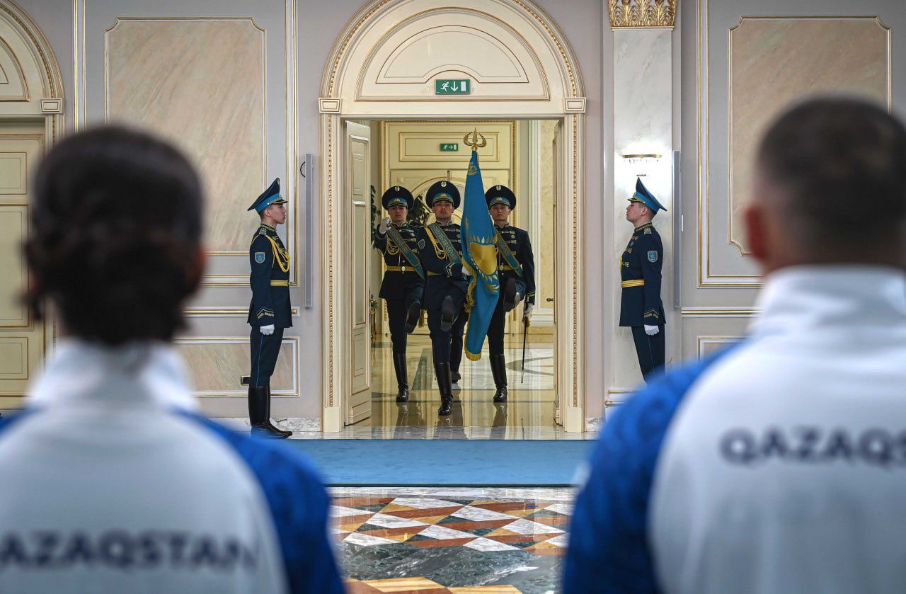 Қасым-Жомарт Тоқаев Қазақстан Республикасының Мемлекеттік туын Ұлттық құраманың мүшелері Денис Никиша мен Аяулым Әмреноваға және Қазақстан паралимпиадалық командасының мүшесі Ербол Хамитовқа табыстады.