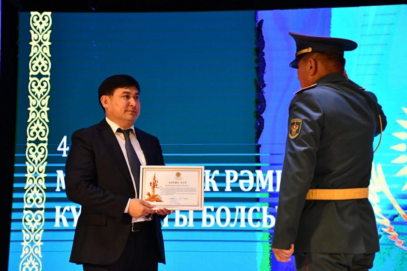Алғашқы құттықтау сөз аудан әкімі Азат Оралбаевқа берілді. Аудан басшысы «Мемлекеттік рәміздер – ел дамуының ажырамас бөлігі. Сондықтан қазақстандықтардың осы рәміздерге деген құрметі, оларды бойтұмардай қастерлеуі ерекше сезіліп тұруы тиіс. Рәміздер арқылы елімізді бүкіл әлем таниды. Өйткені онда қазақ халқының бастан өткізген тарихы, мәдениеті мен дәстүрі көрініс береді. Жастардың отансүйгіштік сезімін оятады, патриотизмге үндейді, батылдыққа тәрбиелейді»-деп, аудан жұртын мерекемен шын жүректен құттықтап, ауданның өсіп-өркендеуіне, қоғамдық жұмыстарға белсене атсалысып жүрген бірқатар азаматтарды марапаттады.