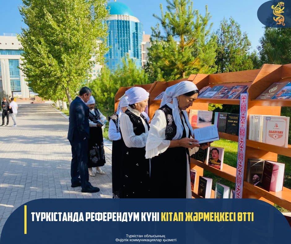 Түркістан қаласындағы Қ.А. Ясауи атындағы ХҚТУ-ң дауыс беру учаскесінде референдум қарсаңында кітап жәрмеңкесі өтті. Науқанға белсене қатысып, өз таңдауын жасауға келген қала тұрғындары арзан бағада түрлі жанрлардағы кітаптарды сатып ала алады. Бүгінгі таңда 10 мыңға жуық студентті білім нәрімен сусындатып отырған оқу орны аумағындағы учаскеге дауыс беру үшін жиылғандардың қарасы көп. Көрме-жәрмеңке де көпшіліктің назарынан тыс қалмады.