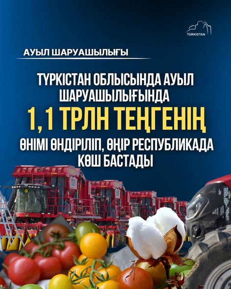 ТҮРКІСТАН ОБЛЫСЫНДА АУЫЛ ШАРУАШЫЛЫҒЫНДА 1,1 ТРЛН ТЕҢГЕНІҢ ӨНІМІ ӨНДІРІЛІП, ӨҢІР РЕСПУБЛИКАДА КӨШ БАСТАДЫ