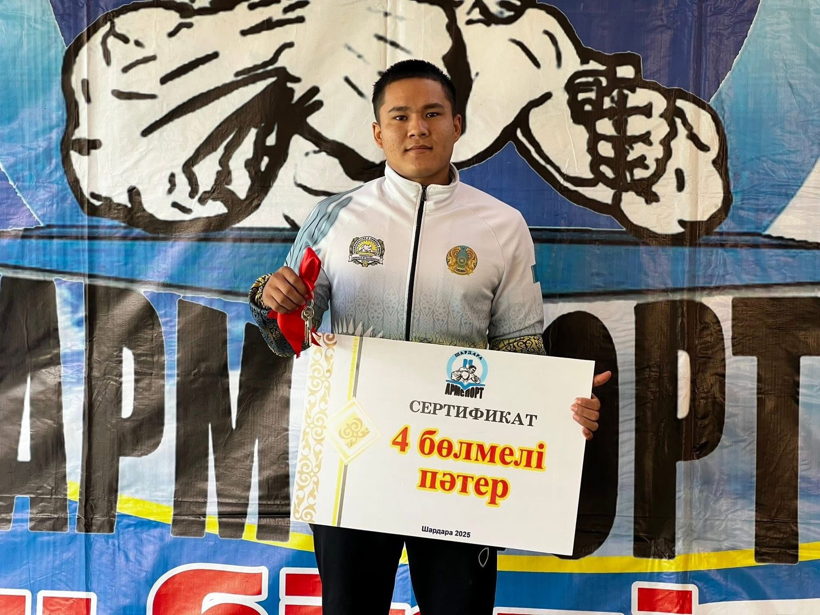Шардара ауданының әкімі Арман Қарсыбаев чемпион спортшыға төрт бөлмелі жаңа пәтердің кілтін салтанатты түрде табыстап, оның ел спортына қосқан үлесін ерекше атап өтті.