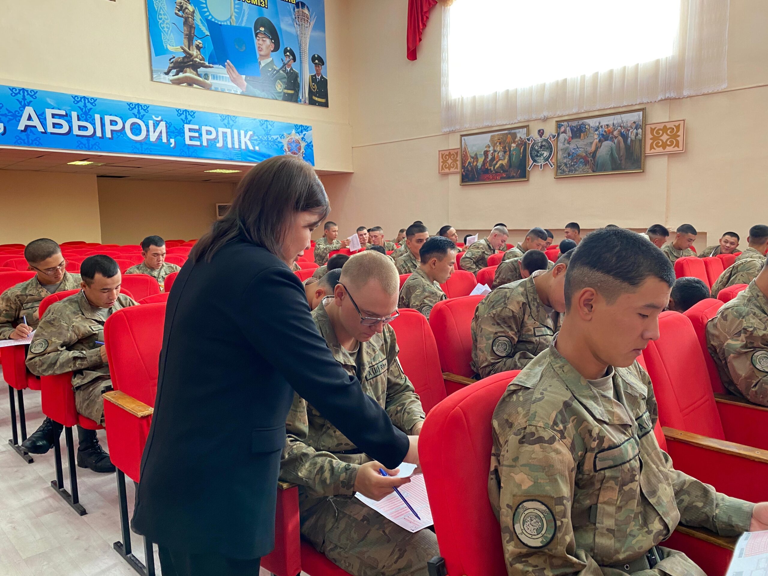 Бүгін ҚР Ұлттық ұланы 6506 әскери бөлімінің жеке құрамы мемлекеттік тілді меңгеру деңгейін анықтау мақсатында “Қазтест” диагностикалық тестін тапсырды. Жалпы саны 450 әскери қызметші қатысқан тестілеу тыңдалым, оқылым, лексика-грамматикалық білім мен жазылым бөлімдерін қамтыды. Бұл — әскери қызметшілердің қазақ тіліндегі коммуникативтік қабілетін арттыруға және мемлекеттік тілді меңгеру деңгейін бағалауға бағытталған маңызды қадам.