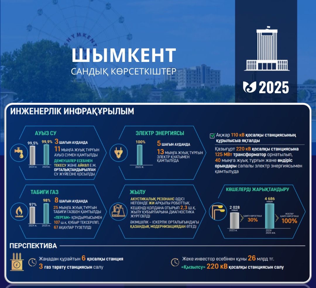 Шымкент қаласында инженерлік инфрақұрылым саласында маңызды көрсеткіштерге қол жеткізілді. 2025 жылы қаладағы ауыз су, электр энергиясы, табиғи газ және жылу жүйелері сапалы түрде қамтамасыз етілді.